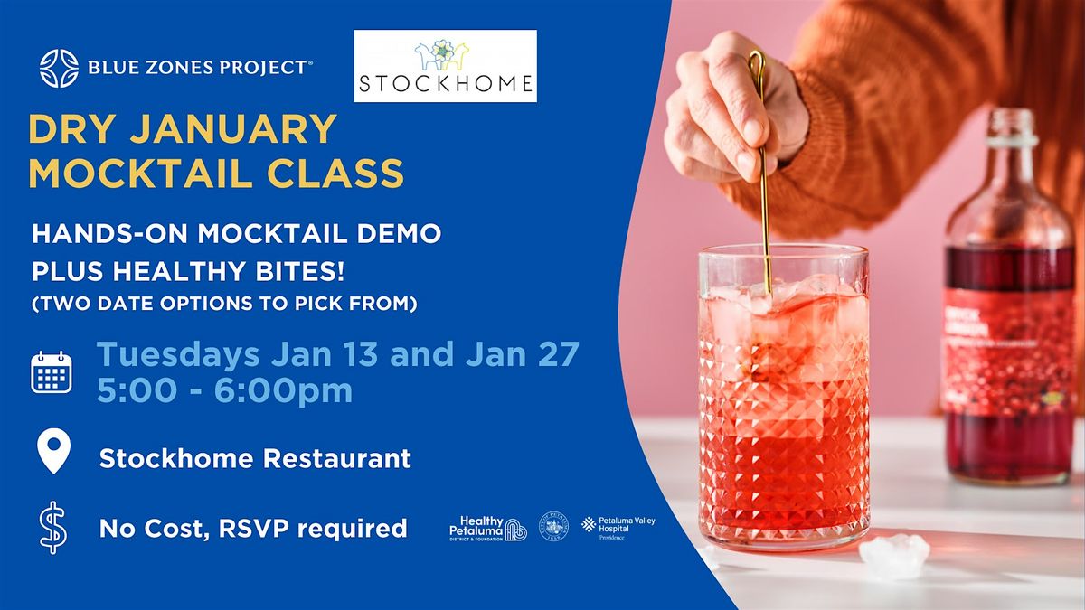 Join for one of two January Mocktail Classes, led by Ashton Sundell of Stockhome. In this hands-on demonstration, participants will have ingredients in front of them and make their own mocktail while watching the demo, followed by healthy bites and community connection time.