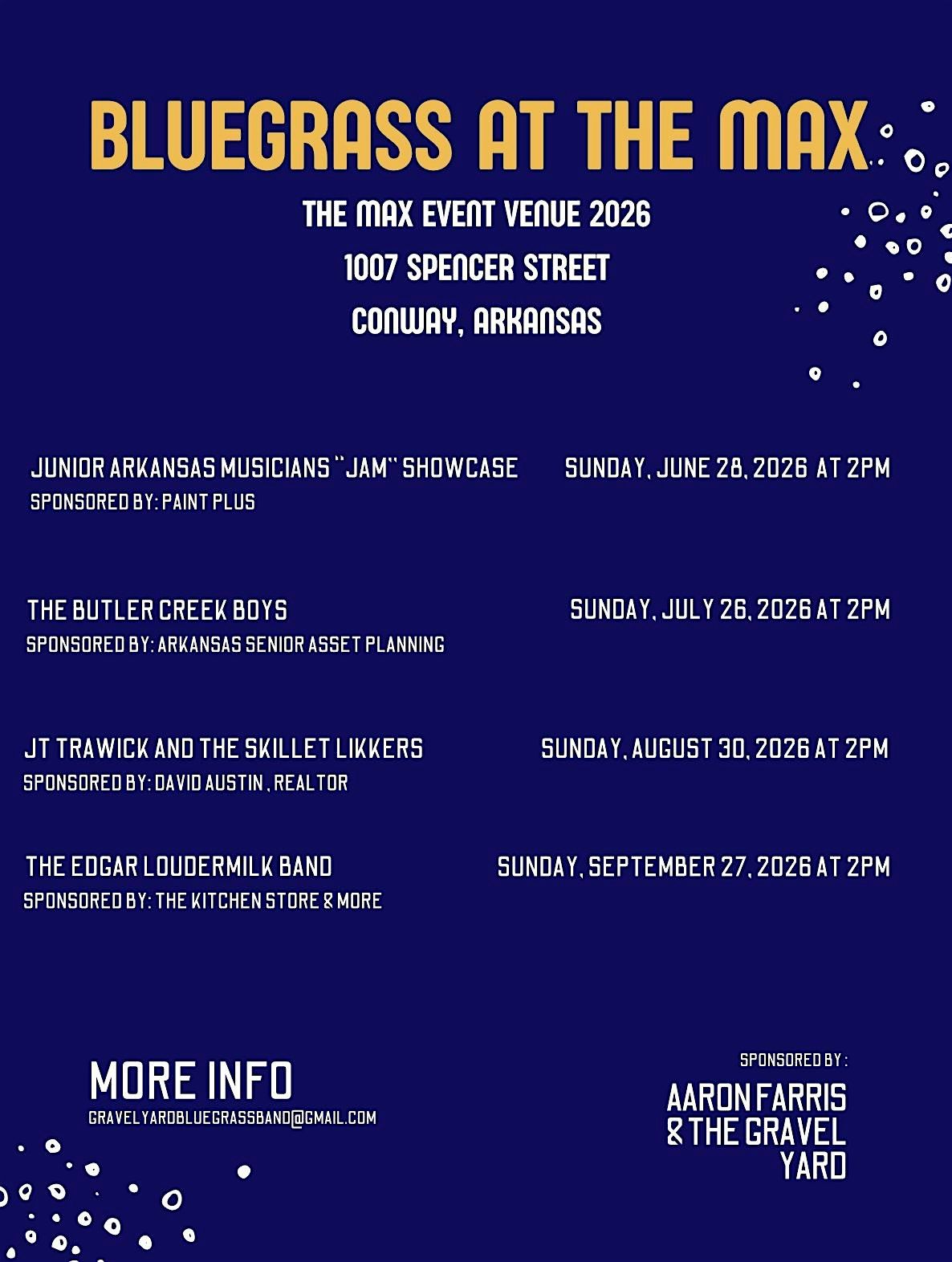 Join us at Bluegrasss at the Max as we showcase the AMAZING young Arkansas Bluegrass Musicians!!! Sponsored by Paint Plus!!!