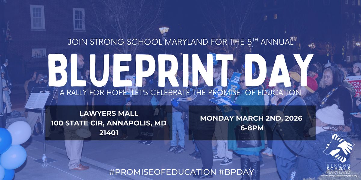 Join Strong Schools Maryland, youth advocates, and partners for the 5th Annual Blueprint Day, a statewide rally celebrating the promise of education. Students, families, educators, and community members will gather at Lawyers Mall in Annapolis to lift up the future of Maryland schools and call for continued progress on and full funding of the Blueprint for Maryland’s Future.