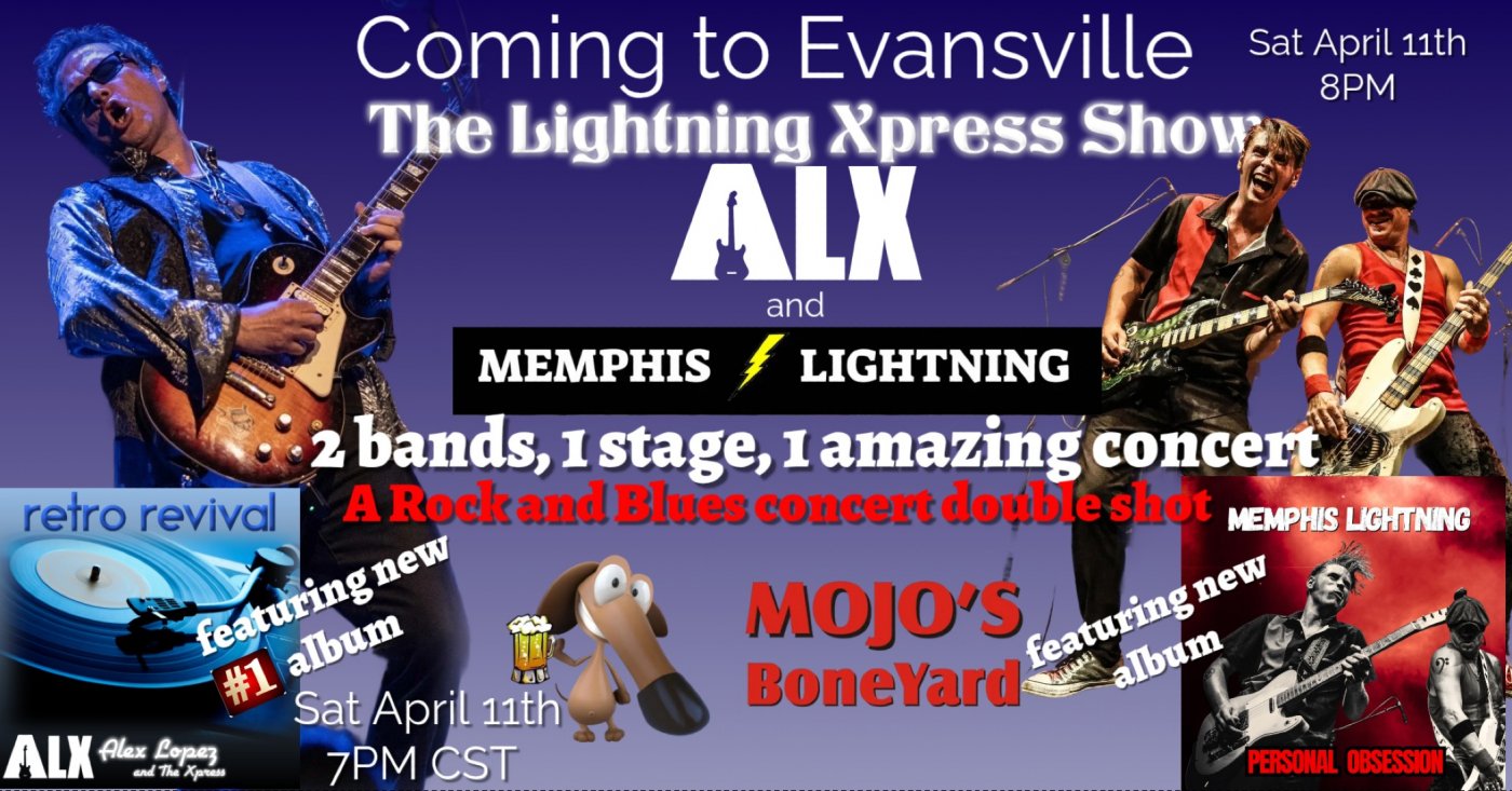 The Lightning Xpress show rolls into Evansville featuring Memphis Lightning & Alex Lopez for one high voltage blues rock night! It's a NEW album double release show, with 2 nationally touring artists that have joined forces to create a special rocking blues concert/event - Saturday April 11th at 7PM CST (8pm EST)