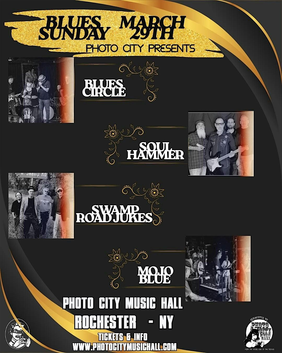 Blues Sunday takes over Photo City Music Hall with an afternoon packed full of live blues, cold drinks, and easygoing Sunday energy. Featuring MoJo Blue, Blues Circle, Swamp Road Jukes, and Soul Hammer, this is the perfect way to spend a Sunday in Rochester—doors open early, the music rolls all day, and the vibes stay light. Come hang, grab a drink, and let the blues carry you through the afternoon. 🎸🍺