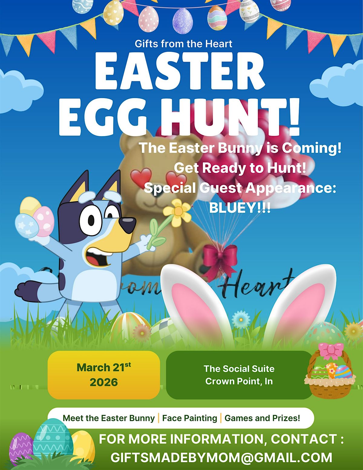Get ready for a fun-filled day with Bluey and the Easter Bunny! Join us for an indoor egg hunt packed with laughter, excitement, and loads of colorful eggs to find. Perfect for the whole family to enjoy together in a cozy, safe space. Don’t miss this chance to celebrate Easter the Bluey way—bring your little ones and hop on over for some unforgettable fun!