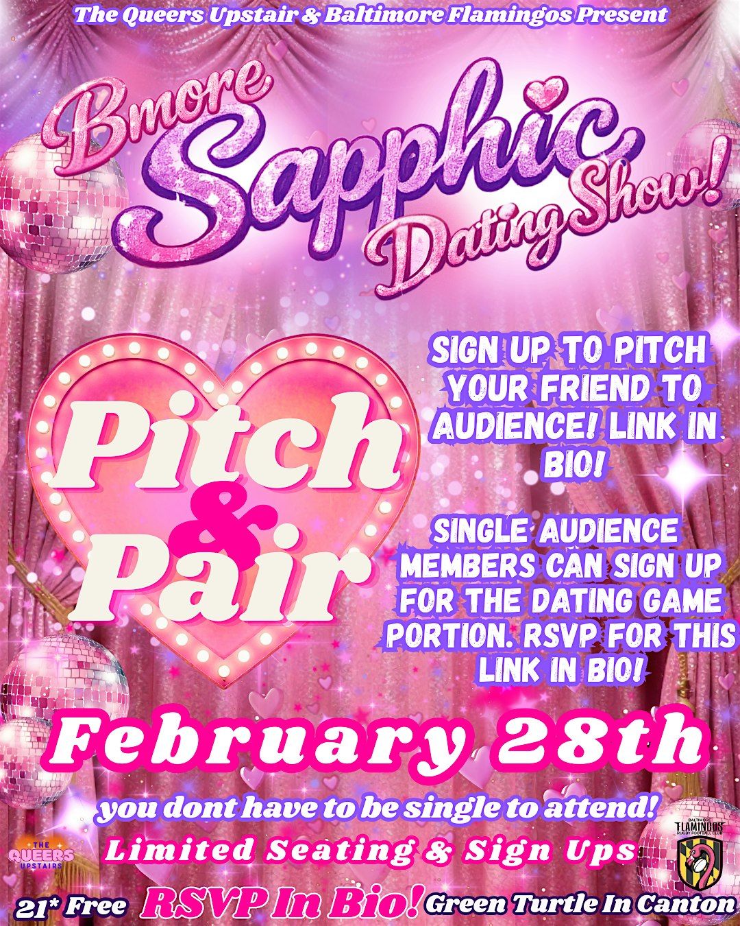 Pitch & Pair is a live, interactive dating game show fundraiser at The Green Turtle benefiting the Baltimore Flamingos and The Queers Upstairs. Five people can create a short PowerPoint presentation to “pitch” their single friend to the audience, after which that friend joins the on stage dating game hosted by Kenny Rooster. 15 Audience members can sign up for a chance to be “blind dates” for our five pitched contestants. Everyone else can simply attend to watch the fun, and vote on who they think should go on a date! Food and drinks will be available for purchase, and all guests must be 21+. RSVP is mandartory to guarantee seating.