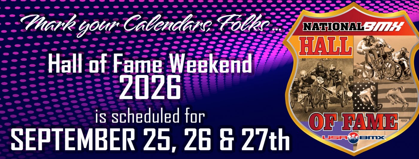 The annual BMX Hall of Fame induction ceremony will be held the weekend of Sept 25 thru 27.