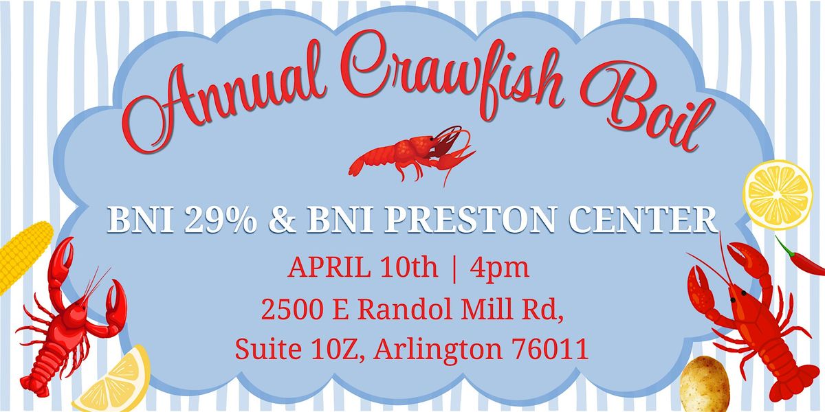 Join us in person for the ultimate crawfish feast! This annual boil is the perfect chance to mingle, enjoy some delicious crawfish, and soak up great vibes with the BNI 29% & BNI Preston Center crews. Don’t miss out on tasty food, cool drinks, and awesome company. Bring your appetite and get ready for a laid-back, fun-filled gathering!