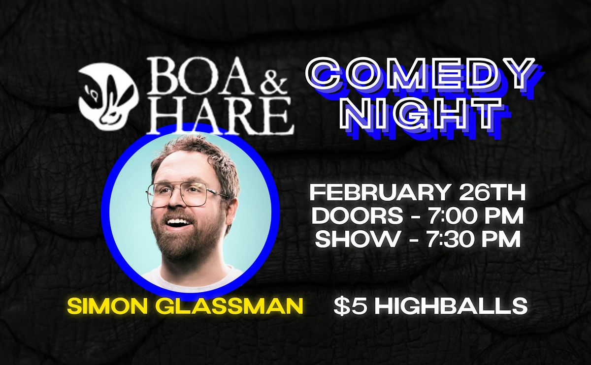 Welcome to Comedy Night at Boa & Hare! Get ready for a night filled with laughter and delicious food. Join us for a hilarious lineup of Canada's best and brightest comedians, including headliner Simon Glassman, as seen on Just for Laughs and CBC Comedy. Sit back, relax, and enjoy a fantastic show at one Chinatown's newest and brightest Cafe's.
