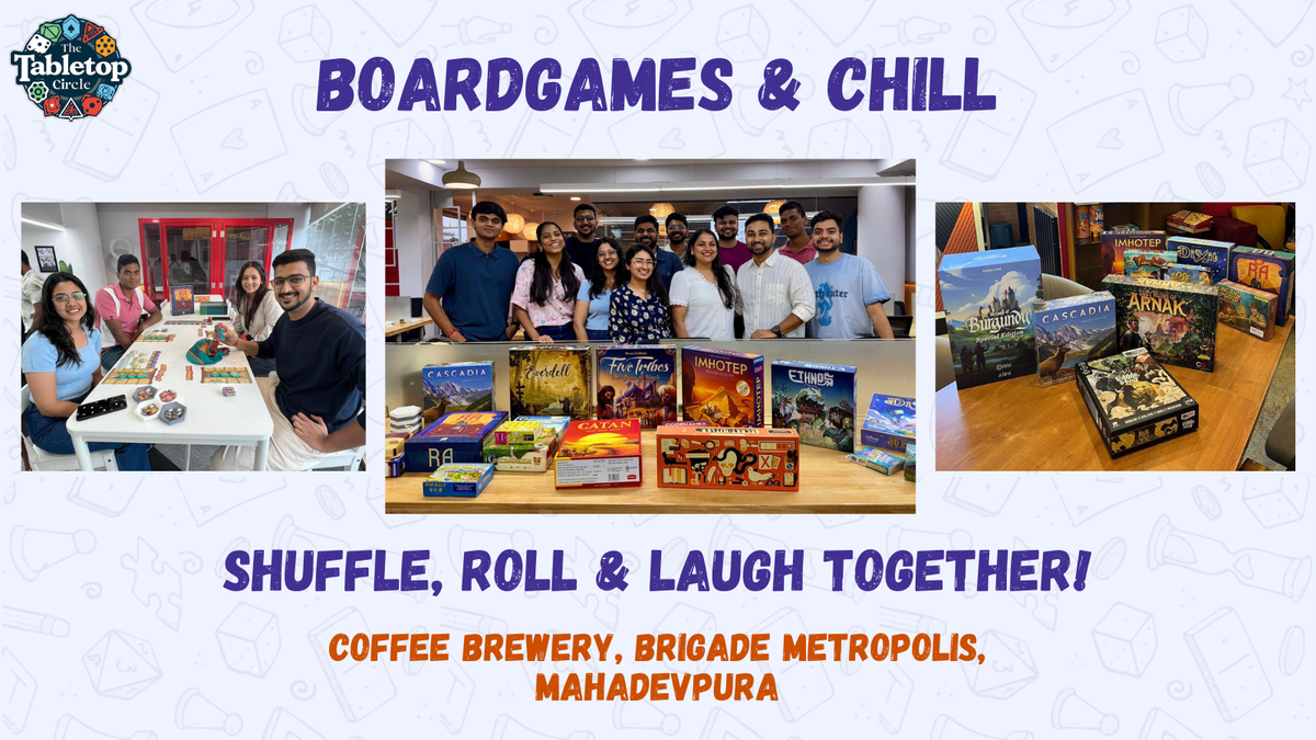 Wrap up your weekend with loads of laughter, tabletop fun & great company!Unwind from the week and ease into the next with a cozy social afternoon of board games. Whether you’re a complete beginner or a seasoned gamer this is the perfect way to spend your weekend - light friendly & filled with good vibes.We’re bringing a curated mix of fun easy-to-learn favorites like Catan, Splendor, Love Letter, The Crew & Secret Hitler - ideal for breaking the ice and keeping the energy upbeat. And if you’re in the mood for something deeper dive into strategy classics such as Arcs Castles of Burgundy, Everdell, Scythe & Concordia Venus and many more.The best part? We’re hosting it right in Mahadevapura - just 1 minute from the metro station making it super easy to drop in join a table & start playing.Come solo or with friends meet fellow game lovers & enjoy a weekend filled with close calls shared victories & plenty of laughs. Join us for a memorable easygoing afternoon of tabletop fun - your perfect weekend escape.