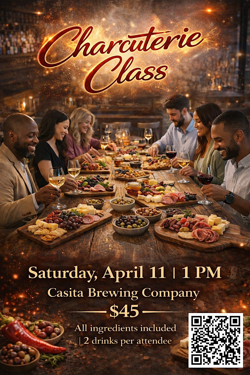 Each attendee will create their own personalized charcuterie board featuring a curated selection of artisan meats and cheeses, fresh fruit, gourmet crackers and pita crisps, and a touch of something sweet.