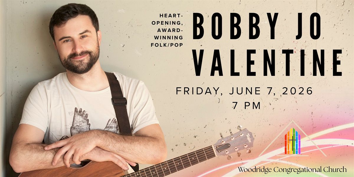Woodridge Congregational Church is thrilled to feature Bobby Jo Valentine live in person as part of our Pride Month celebration. Bobby Jo Valentine’s music exists outside the lines of any genre, but the music’s thoughtful, spirit focused lyrics and catchy melodies reach listeners across all walks of life. The poetic nature and spiritual focus of his stories and songs has resulted in notable awards and a growing, loyal following around the country. He’s found a voice with original, hopeful songs about the gentle everyday spiritual awakenings of an openhearted life.