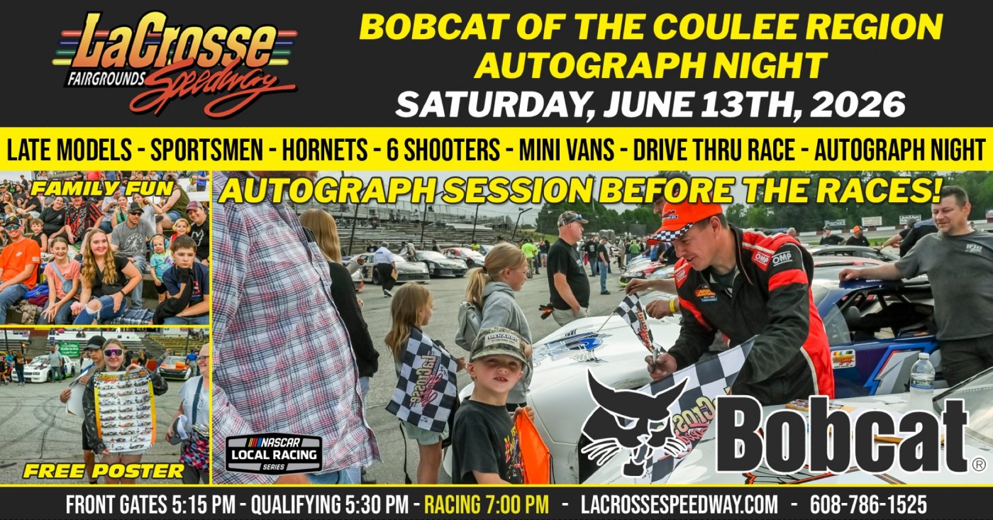 Get ready for one of the most popular fan events of the entire season! Join us on Saturday, June 13th, 2026 at 7:00 PM for Bobcat of the Coulee Region Autograph Night, where the first 500 fans receive a FREE 2026 Collectors Drivers Poster. It’s the perfect night to meet your favorite drivers, grab autographs, and enjoy a full evening of short‑track excitement at LaCrosse Speedway in West Salem, Wisconsin!