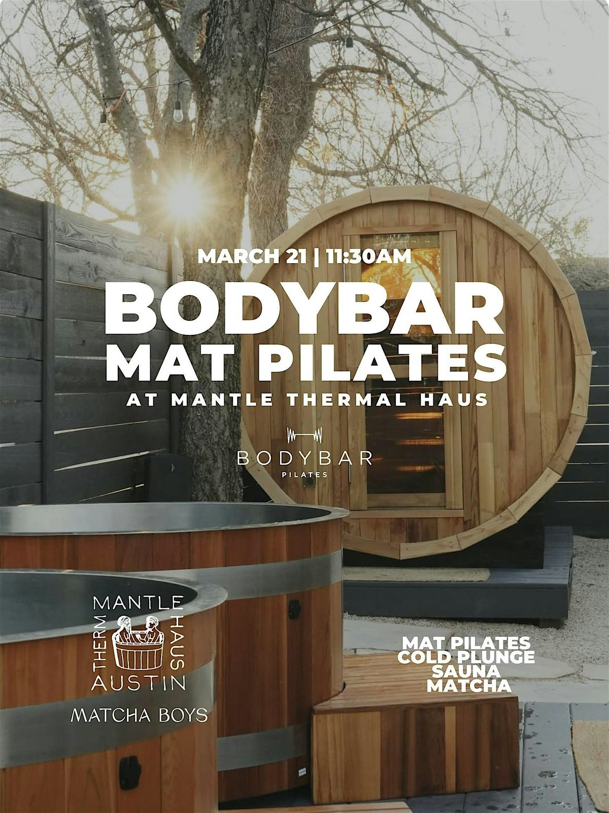 Join BODYBAR Pilates South Lamar for a fun and energizing Mat Pilates session at Mantle Thermal Haus! Perfect for all levels, this class will help you strengthen your core and improve flexibility. Mark your calendar for March 21, 2026 at 11:30 AM CST. Doors open at 11:00am. Come ready to move and feel great in a relaxed, welcoming space.