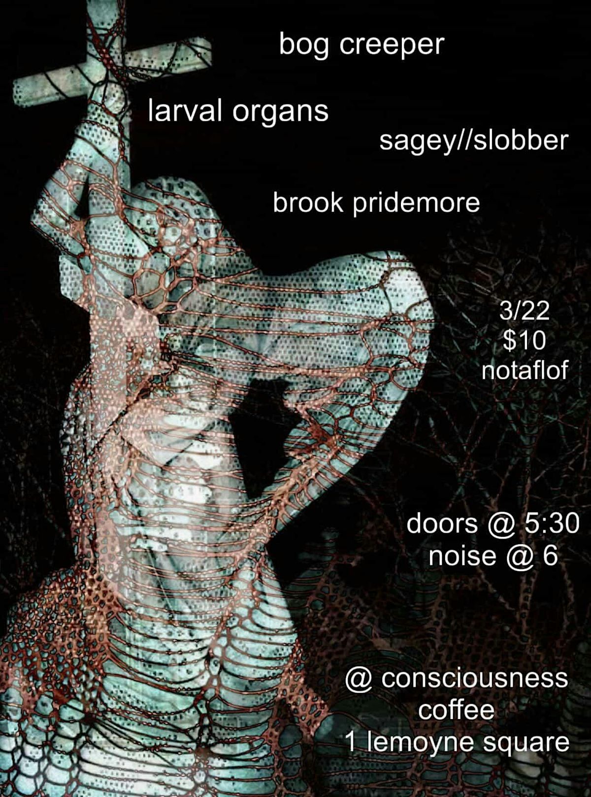 join us for another DIY local show featuring Bog Creeper, Larval Organs, Sagey/Slobber & Brook Pridemore!