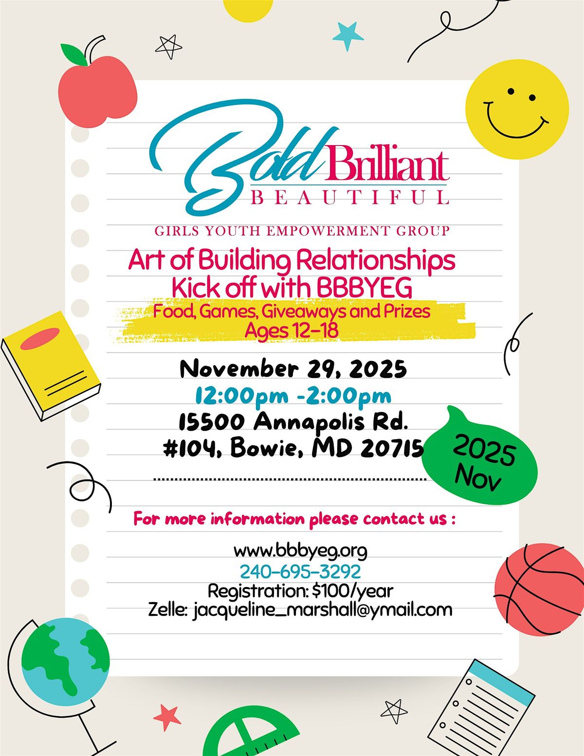 Welcome to the BOLD BEAUTIFUL BRILLIANT GIRLS YOUTH EMPOWERMENT GROUP KICK OFF event! ? Join us at 15500 Annapolis Rd suite 104 on November 29, 2025 at 12:00 PM (Eastern Time) to celebrate and empower our amazing girls. This event is all about inspiring confidence, fostering leadership, and building strong friendships. Let's come together to support and uplift each other in a fun and welcoming environment. Don't miss out on this incredible event and prepare to kick off this empowering journey! See you there!