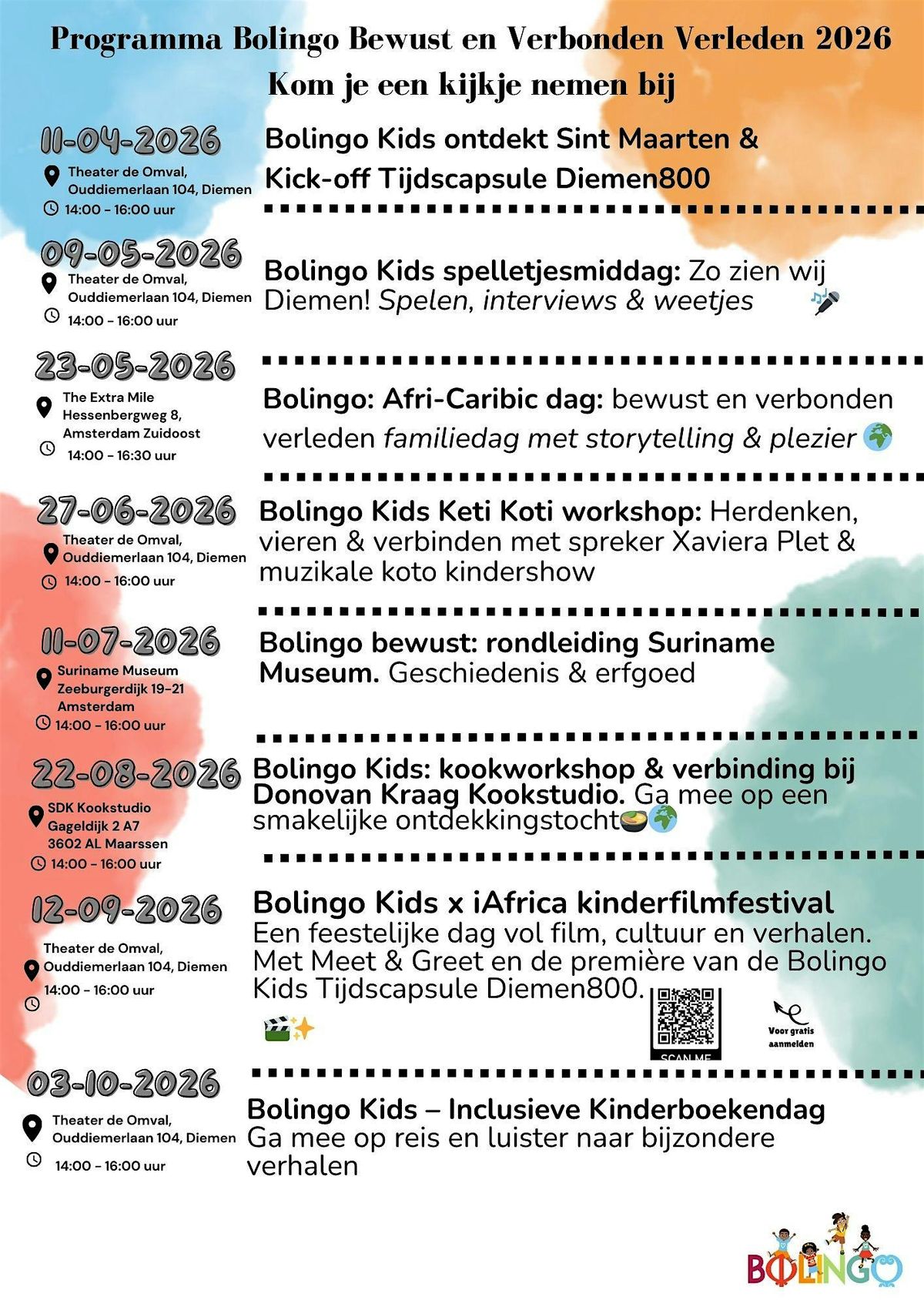 Er is een speciaal Bolingo Kids kinderprogramma waarin kinderen op een speelse en leerzame manier kennismaken met cultuur, geschiedenis en identiteit. We verbinden de Afrikaanse én de Caribische cultuur met elkaar en staan stil bij wat ons met elkaar verbindt.