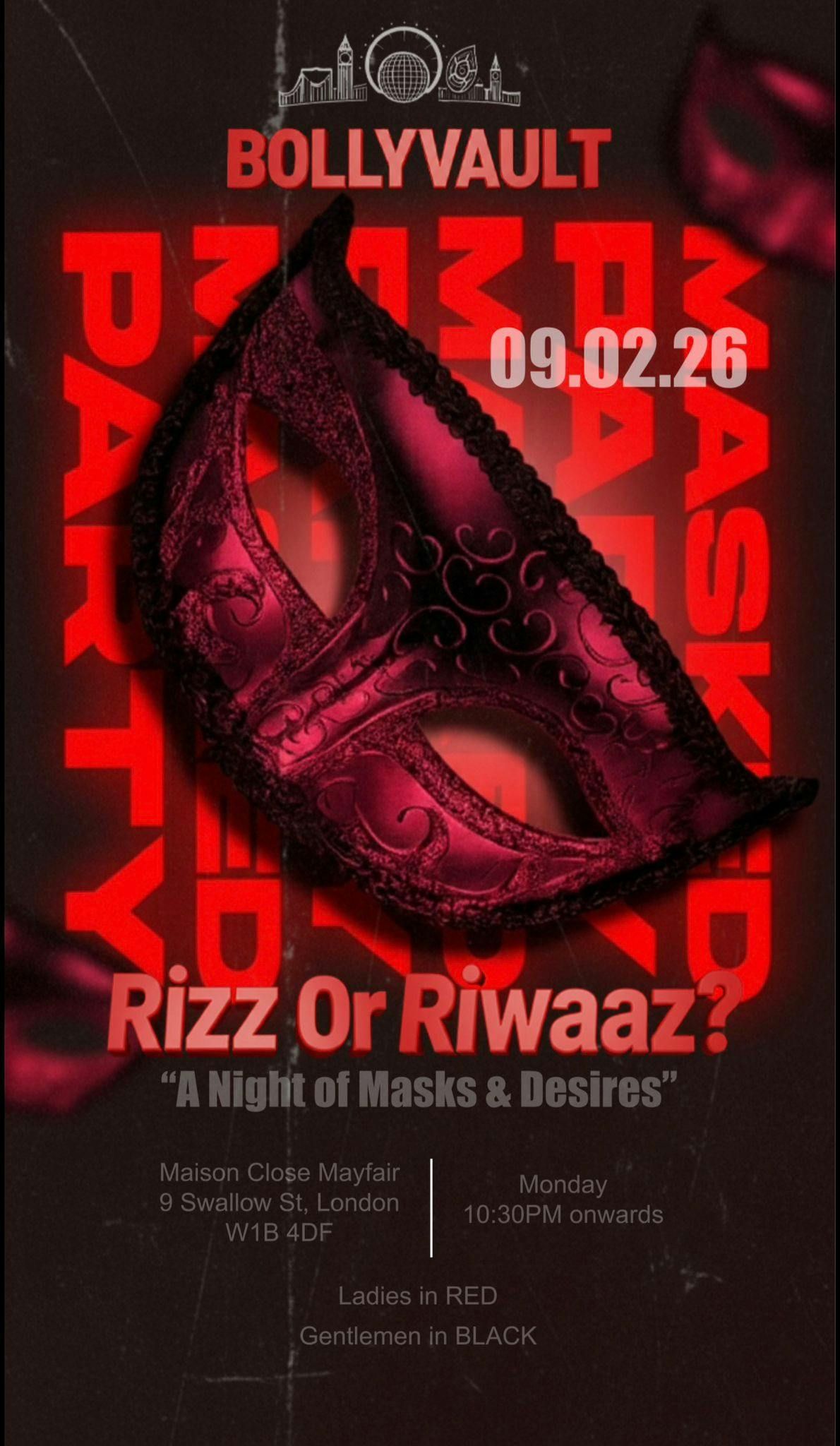 BollyVault presents: Rizz or Riwaaz — an exclusive Bollywood Masquerade Night in the heart of Mayfair, designed for those who appreciate luxury nightlife, seductive energy, and elite vibes.