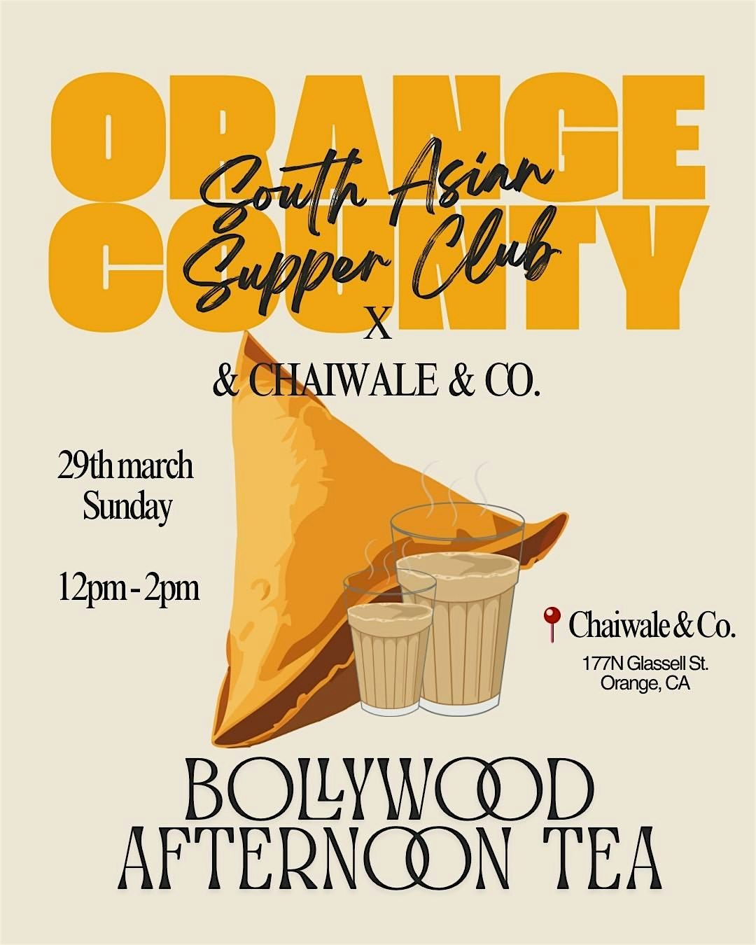 Grab your fascinator and your Sunday Best and join us for a delightful afternoon filled with the vibrant flavors and classic music of Bollywood at our event located at 177 N Glassell St. Orange, CA. Indulge in a unique experience of traditional Indian chai paired with delectable treats. Don't miss out on our new series of events every Sunday.