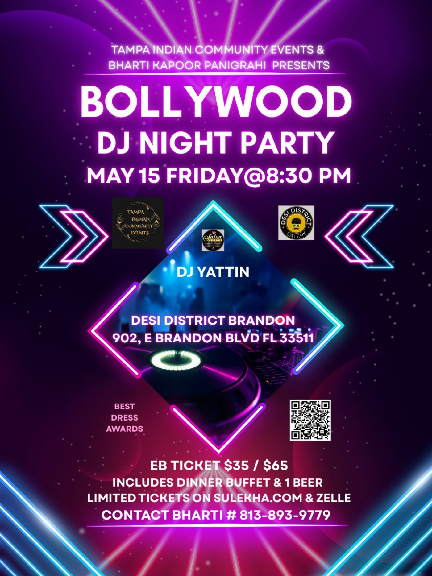Step into a vibrant world where music and dance collide in a mesmerizing fusion at the Bollywood DJ Night Party! Join us on May 15, 2026, at 8:30 PM at Desi District Brandon, 902 E Brandon Blvd, Brandon, FL 33511, United States, Brandon, for a night of pulsating beats and electrifying rhythms that will transport you to the magical realm of Bollywood.
