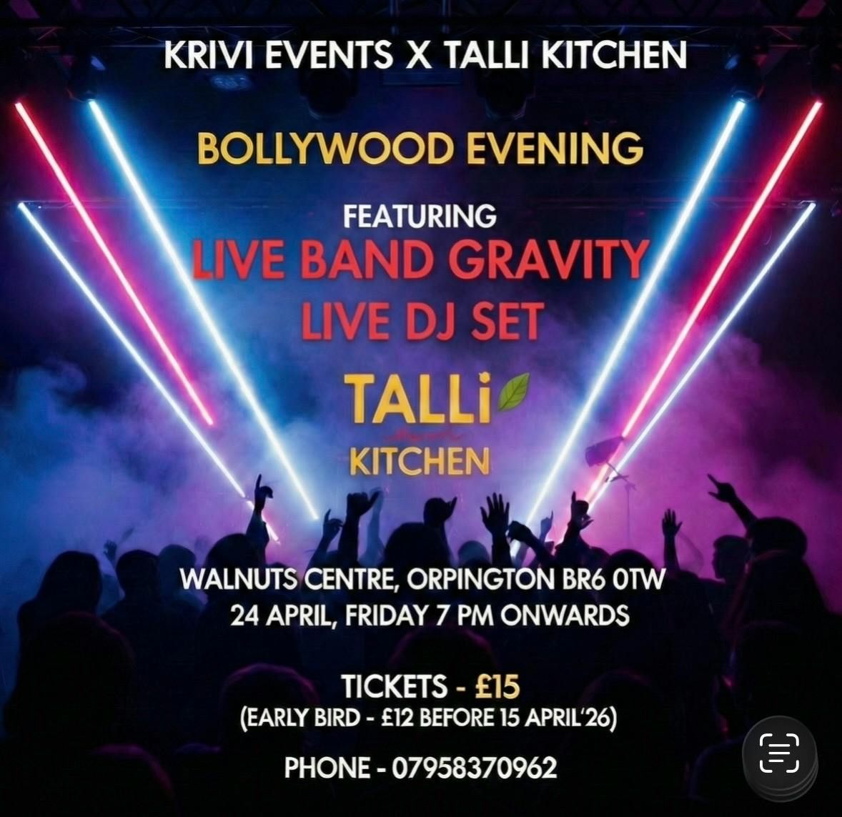Krivi Events in collaboration with Talli Kitchen is bringing another Bollywood Evening on 24 April’26. After the success of the previous events and love shown by all our guests, we continue to strive to deliver a better experience every time we put up a show. For 24 April, Friday the show starts at 7 pm and this time we are showcasing the house band of Krivi Events known as Gravity for a live performance followed by a Bollywood Live DJ set. The Live band Gravity will present popular Bollywood covers of Kishore Kumar, Sonu Nigam, Arijit Singh, KK and many more. DJ Nav will add to the show with his electrifying beats to drive everyone to the dance floor. We would look forward to see you on 24 April to welcome and enjoy the summer vibe at Talli Kitchen. The tickets is for entry only. Kids are allowed for this event (Above 10 years kids need a ticket and below 10 years are welcome for free)