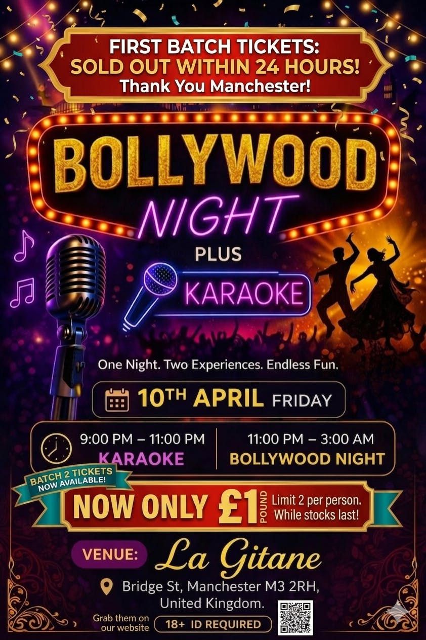 BOLLYWOOD NIGHT + KARAOKE! 💃✨Get ready to sing your heart out and dance the night away at La Gitane on friday 10th April. This is your CHANCE to join the fiesta at this unbeatable price—grab yours NOW and secure your spot for a night of two experiences and endless fun!