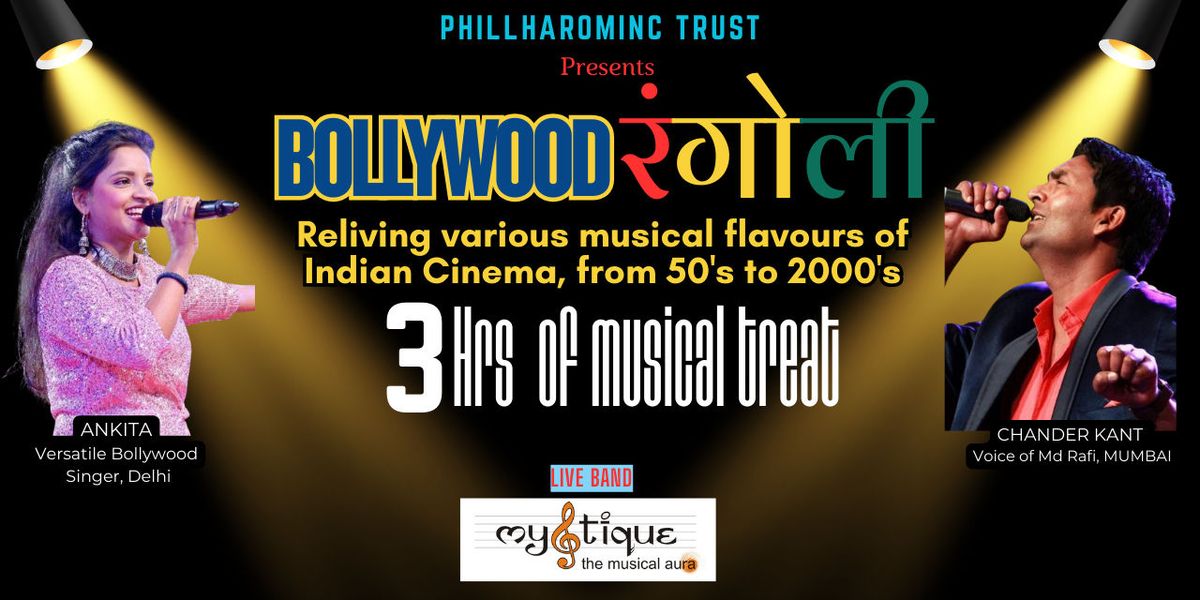 “Bollywood Rangoli” is a vibrant live musical evening celebrating the magic of Bollywood — from soulful retro melodies to energetic modern hits. The event features talented singers from Delhi NCR performing evergreen songs with a live orchestra. Presented by Philharmonic Trust, it promises an unforgettable blend of nostalgia, rhythm, and color in true Bollywood style.