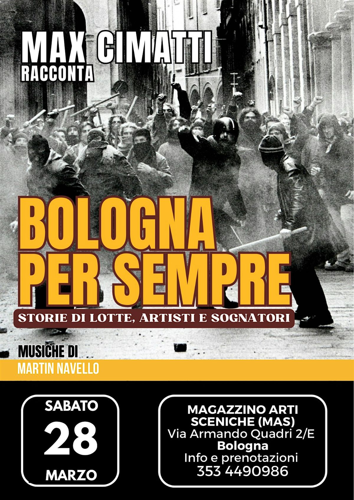 🎟️ Ingresso su prenotazione: https://www.magazzinoartisceniche.com/bologna-per-sempre-storie-di-lotte-artisti-sognatori-2026/#prenota