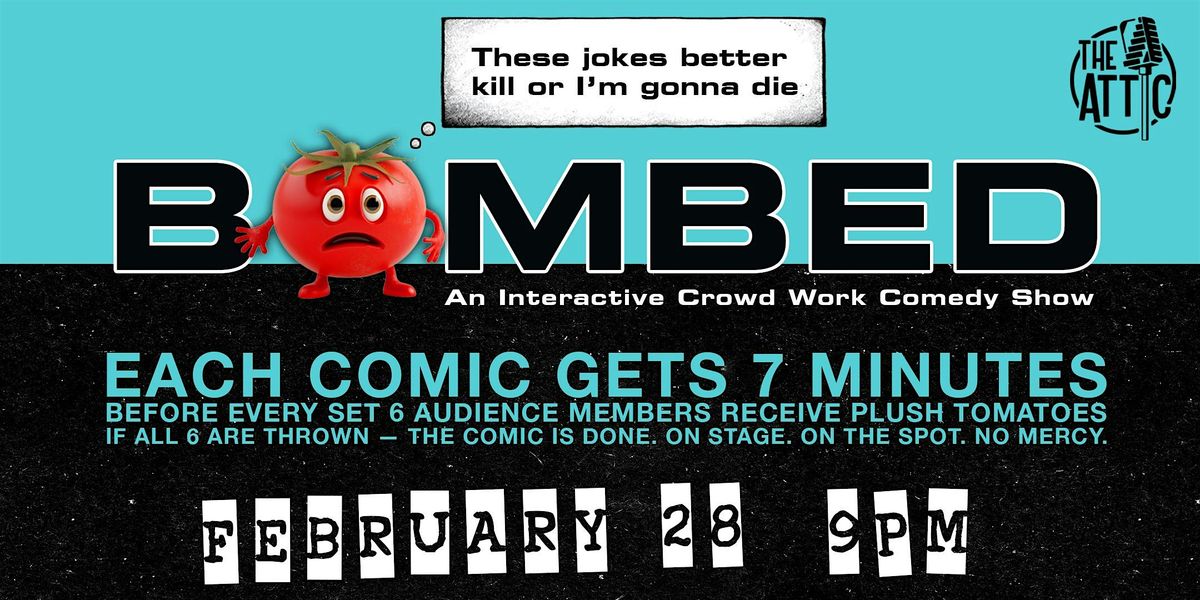 Join us Saturday December 6th at 7:00 PM for BOMBED — a wild, unpredictable comedy show at The Attic Comedy Club where the audience gets the power… and the tomatoes.