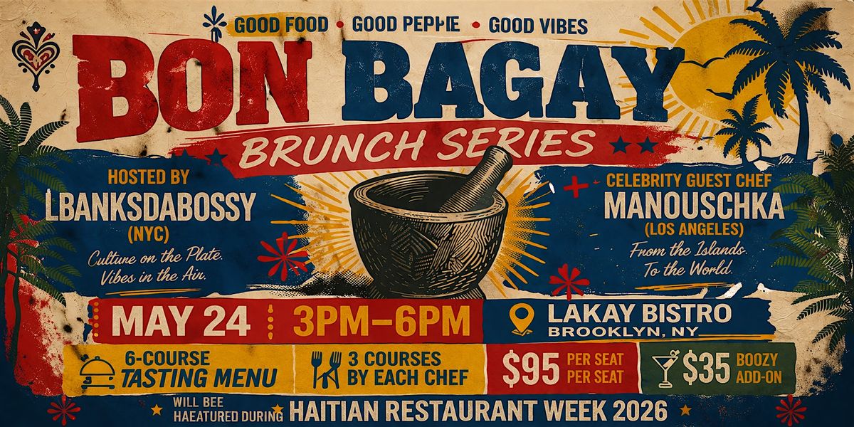 Chef LBANKSDABOSSY (NYC) x celebrity Chef Manouschka (LA). 6-course Haitian brunch, vibes, Boozy add-on. May 24. Limited seats.