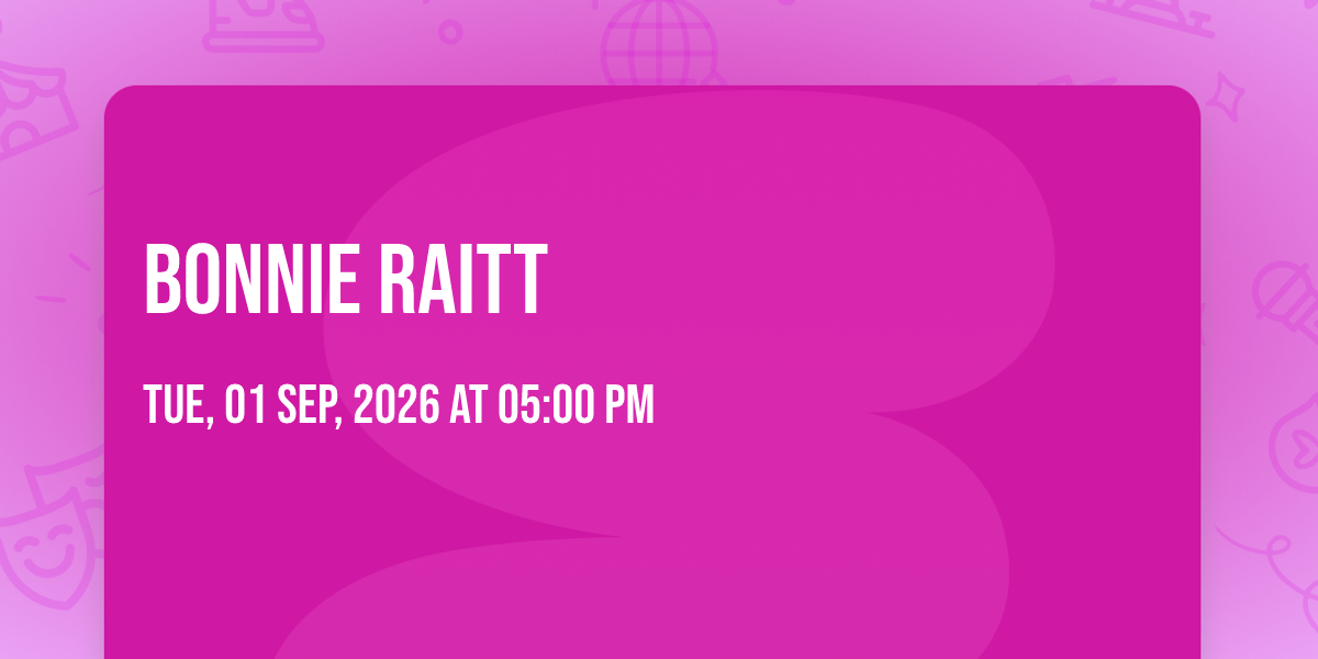 🌟 Be part of history at Bonnie Raitt, an extraordinary gathering that will captivate your imagination! 🏛️ The prestigious Alberta Bair Theater in Billings, MT sets the stage for an unforgettable experience on September 1st, 2026 at 05:00 PM. ✨ They are bringing together the finest elements of entertainment and innovation to create moments that will take your breath away. From the moment you arrive, you'll be immersed in an atmosphere of wonder and excitement. 🎯 This carefully planned event ensures every guest experiences something truly special. 🎊 Early booking is recommended for this must-attend event of the season!http://maps.seatics.com/AlbertaBairTheater_EndStage2_2024-08-23_2024-08-23_0718_08232024_093040_SVGC_tn.png