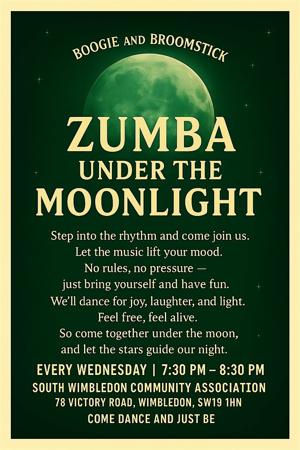 “Dance under the moon! Join our joyful Zumba class every Wednesday, 7:30–8:30 PM . COME DANCE AND JUST BE..