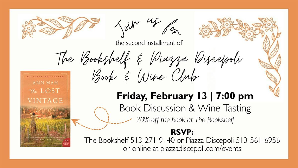 Join Piazza Discepoli and The Bookshelf for a book and wine club! We will be reading The Lost Vintage by Ann Mah and tasting wine based on the story.