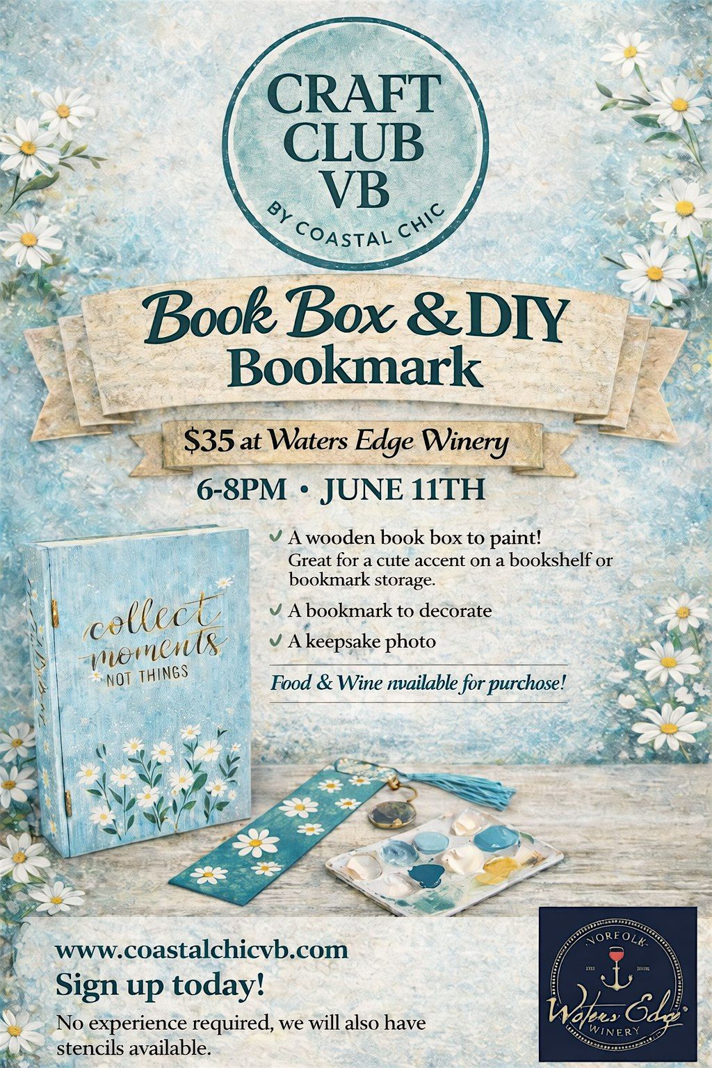 Join Craft Club VB by Coastal Chic for a creative night out at Waters Edge Winery! In this hands-on workshop, you’ll paint and personalize a charming wooden book box — perfect for styling on a bookshelf or storing bookmarks and small keepsakes. You’ll also decorate a coordinating bookmark to complete your set.