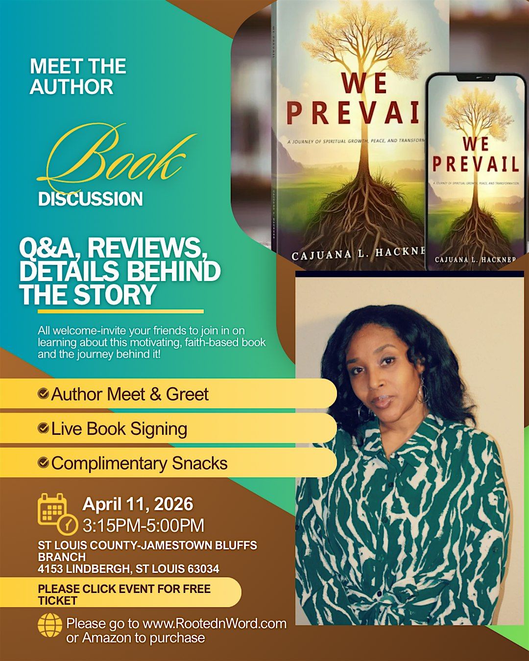 Meet the Author!! Join Cajuana L Hackner for a Book discussion , Q&A, activities, book signing and reviews of her debut book "We Prevail: A Journey of Spiritual Growth, Peace and Transformation. Please invite friends to join in on learning about this motivating, faith based book and the journey behind it. Also, Celebrating 1 year since the book release!!