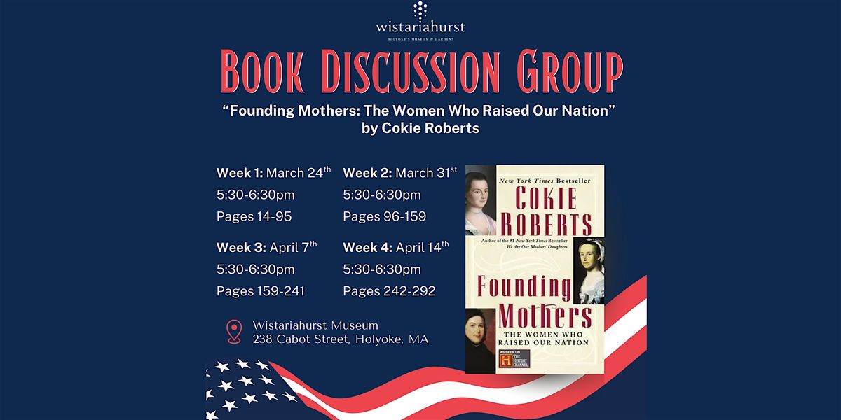 Join fellow readers for the next book discussion group at Wistariahurst beginning March 24th, 2026. This book club, coinciding with Women’s History Month, will dive into "Founding Mothers: The Women Who Raised Our Nation” by Cokie Roberts.