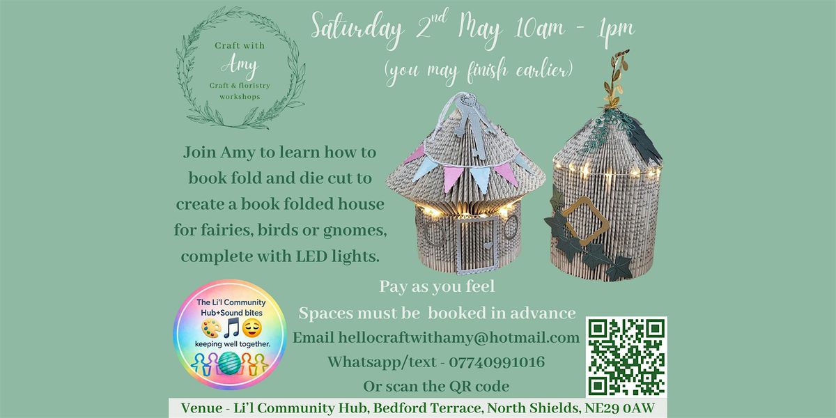 Join Amy to learn two crafts - book folding and die cutting. You will be shown how to bookfold a house and how to use die cuts which will create the decoration of your house. Your house can be for a fairy, bird or other creature! I have allocated 3 hours for the workshop but you may finish your house in around 2 hours depending on the decoration you choose to add.