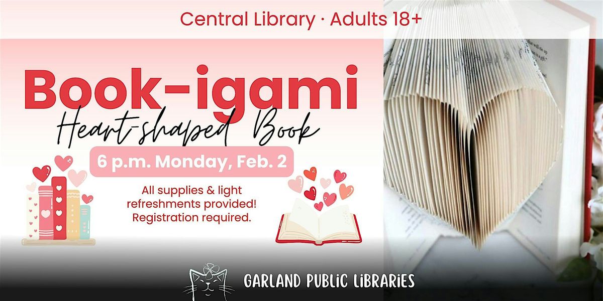 Registration opens 10 a.m. Monday, Jan. 26. Create a folded heart design from a book to celebrate Valentine's Day! All supplies and refreshments are provided.