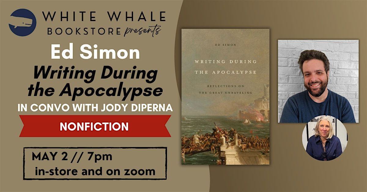 We are thrilled to welcome our friend Ed Simon back to the Whale to celebrate the publication of Writing During the Apocalypse, an ars poetica for our days of calamity. Each section offering a syllabi for four different types of calamities—the epidemiological, militaristic, technological, and climatological. Simon will be joined in conversation by local writer and literary citizen, Jody DiPerna.