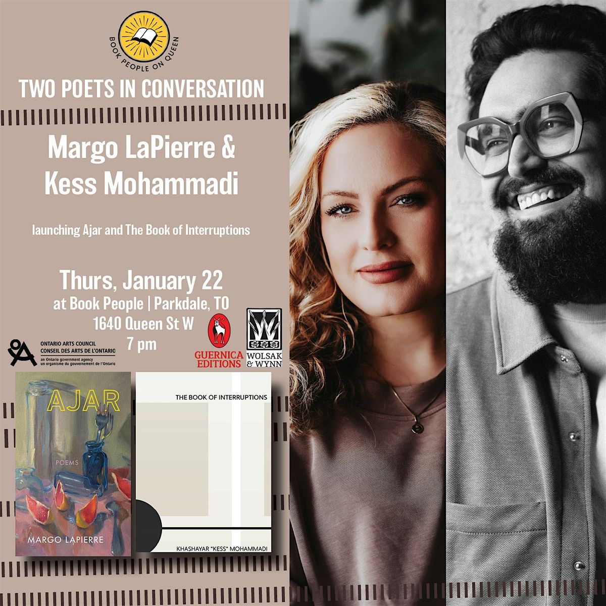 Two Poets in Conversation celebrates the launch of two stunning new collections. Join us at Book People On Queen with poets Margo LaPierre and Kess Mohammadi for an intimate evening of readings and conversation as they explore the voices, themes, and inspirations behind Ajar and The Book of Interruptions. Whether you're a longtime poetry reader or discovering these voices for the first time, this is a perfect opportunity to connect with these writers and their work.