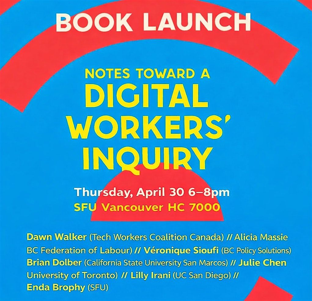 Dawn Walker (Tech Workers Coalition Canada)//Alicia Massie (BC Federation of Labour)//Véronique Sioufi (BC Policy Solutions)//Brian Dolber (California State University San Marcos)//Julie Chen (University of Toronto)//Lilly Irani (UC San Diego)//Enda Brophy (SFU)