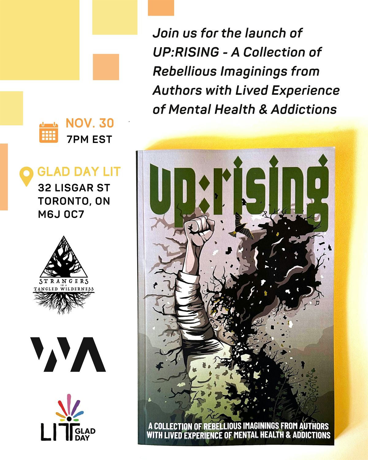 The launch of Up:Rising — A Collection of Rebellious Imaginings from Authors with Lived Experience of Mental Health & Addictions. Join us to meet the contributing writers and editors, hear live readings, and take home your own signed copy of the anthology!