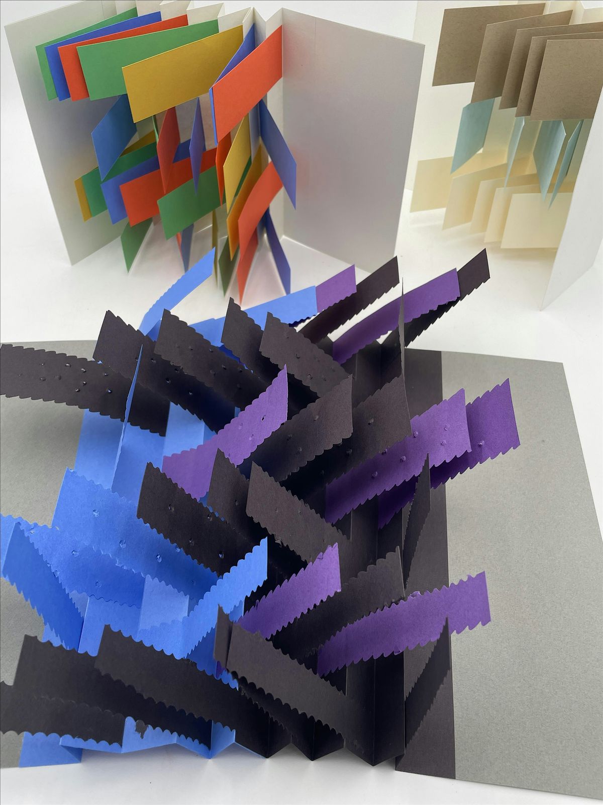 A flag book is a unique, sculptural artist book structure invented by Hedi Kyle in 1979, featuring alternating accordion-folded panels (concertina) with pages or "flags" attached in rows that move and extend outward. When read page by page, the viewer sees disjointed fragments of image and text. When the spine is pulled fully open, these fragments assemble a panoramic spread. This transformation is accompanied by a delightful flapping sound. The spine and covers provide opportunities for additional imagery. In this half-day workshop, students will make their own flag book with a concertina spine, multiple small pages, and hard covers.