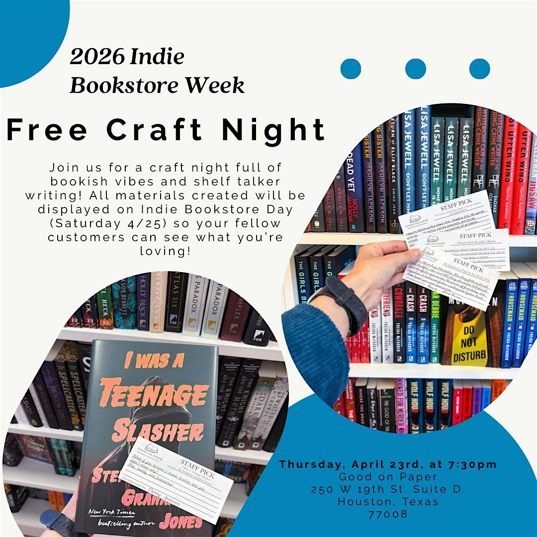 Join Good on Paper for a craft night full of bookish vibes and shelf talker writing! All materials created will be displayed on our shelves come Indie Bookstore Day (Saturday 4/25) so your fellow customers can see what you’re loving! This is a great way to participate in AND contribute to Indie Bookstore Day 2026 while having a chill but fun evening.