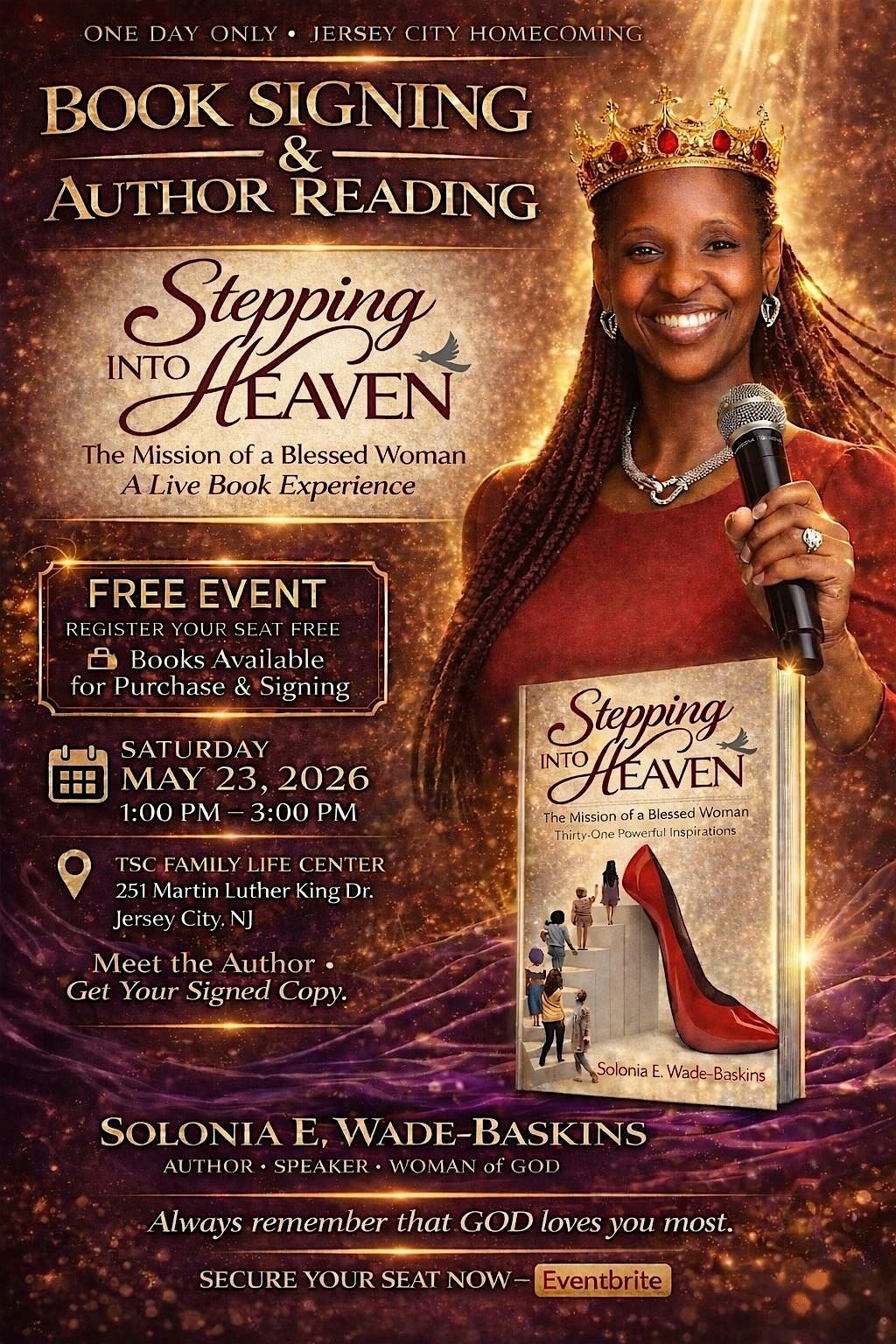 Join Solonia E. Wade-Baskins — Author, Speaker, Woman of GOD — as she returns to her hometown for a powerful Book Signing & Author Reading of her transformational devotional: