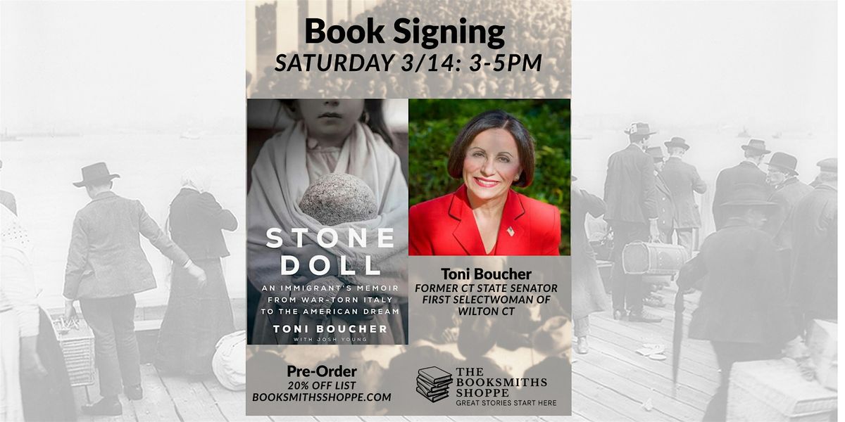 We are honored to welcome Toni Boucher — former Connecticut State Senator and First Selectwoman of Wilton — to The BookSmiths Shoppe as she signs copies of her powerful memoir, Stone Doll.In Stone Doll: An Immigrant’s Memoir from War-Torn Italy to the American Dream, Toni shares her deeply personal journey from a five-year-old girl leaving a stone farmhouse in post-war Italy… to building a life in America marked by resilience, entrepreneurship, public service, and leadership.