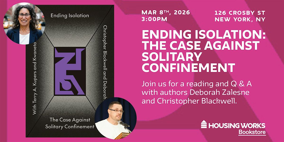 Join Deborah Zalesne as she reads passages from Ending Isolation: The Case Against Solitary Confinement and leads a Q&A about the psychological harm and real-life consequences of our current incarceration system. Author Christopher Blackwell will call in from Pr*son to answer questions and share a perspective rarely disclosed to the general public.
