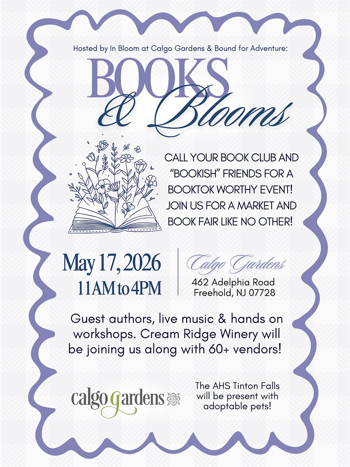 Browse books, meet authors, shop local makers, enjoy music, wine, crafts & adoptable pets at this unique spring garden event!