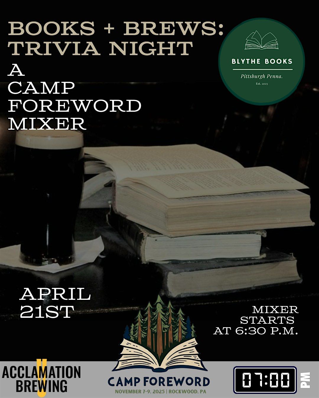 Come hang out with fellow campers on Tuesday, April 21 from 6:30–9 PM at Acclamation Brewery (314 Arch St, Verona, PA 15147). At 6:30 pm, doors open--enjoy a themed cocktail or browse books for sale from Blythe Books!