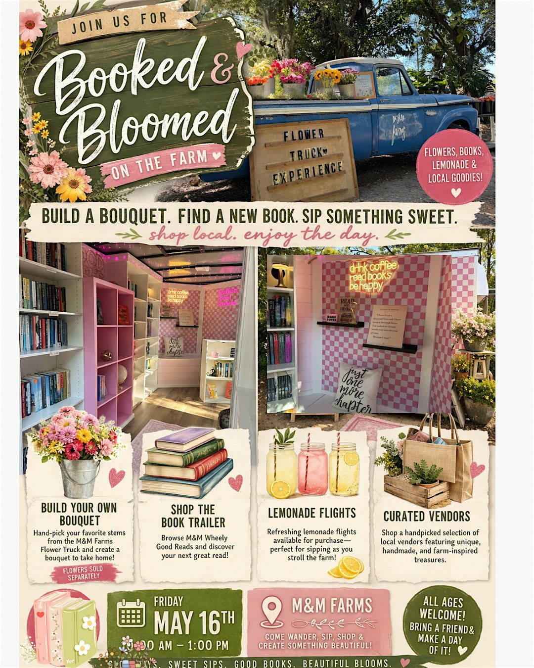 Join us for a charming day on the farm where flowers, books, and local shopping come together for the perfect slow-paced outing.