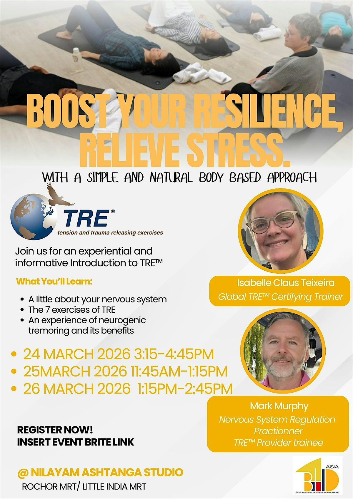 Come and experience TRE™ (TRE Trauma and Tension Releasing Exercises ), a natural body-based technique that helps you release your stress.