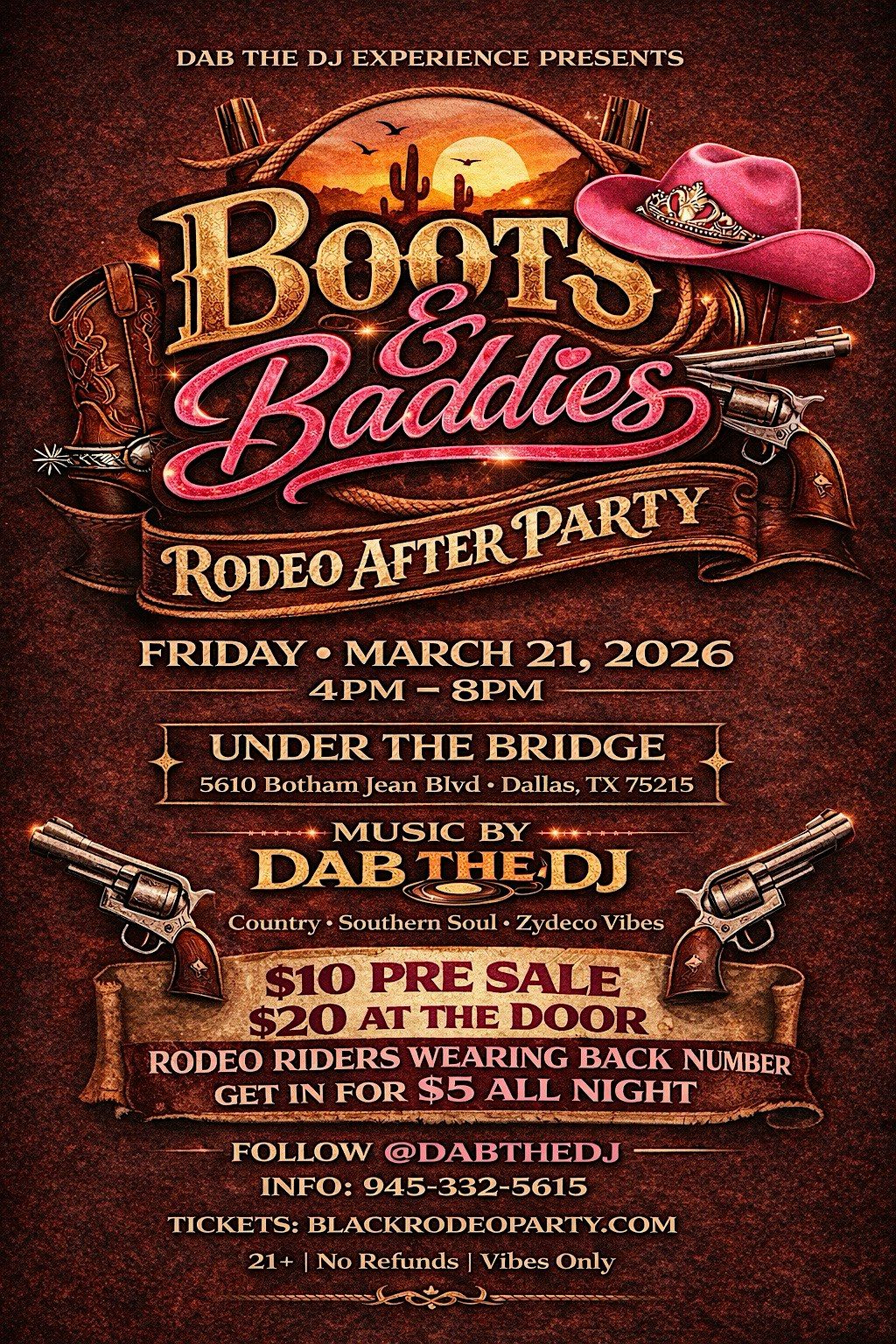 Ready to kick up your heels? Join us in person for the Boots & Baddies Rodeo After Party! It's all about good vibes, great music, and dancing the night away with fellow rodeo lovers. Bring your boots, your best attitude, and get ready for an unforgettable night of fun and friends. Don’t miss out!