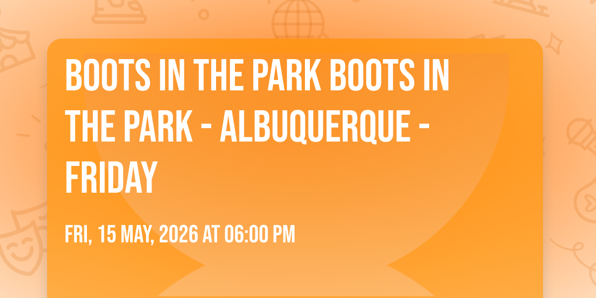 📍 Location: 35.1989, -106.579✨ Enter a world of endless possibilities at Boots In The Park Boots In The Park - Albuquerque - Friday, where every moment tells a story! 🏛️ The stunning Balloon Fiesta Park in vibrant Albuquerque, NM transforms into a realm of wonder on May 15th, 2026 at 06:00 PM. 🌟 They have crafted an experience that goes beyond the ordinary, combining elements of surprise, delight, and pure entertainment. Every detail has been thoughtfully considered to ensure your journey with us is nothing short of extraordinary. 🎯 Join fellow adventure seekers and memory makers in this celebration of imagination and innovation. 🎊 Reserve your spot today and be part of something truly special!
